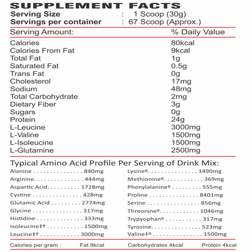 Dosage:- Add one rounded scoop to 200-250 ml of water or skimmed milk and mix thoroughly, for maximum results use before and after workout, and other strategic times daily.