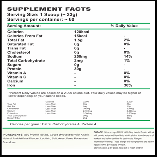 “DNS, 100% Soy Isolate Protein” is an intelligent way to incorporate the healthful benefits of soy into your diet.